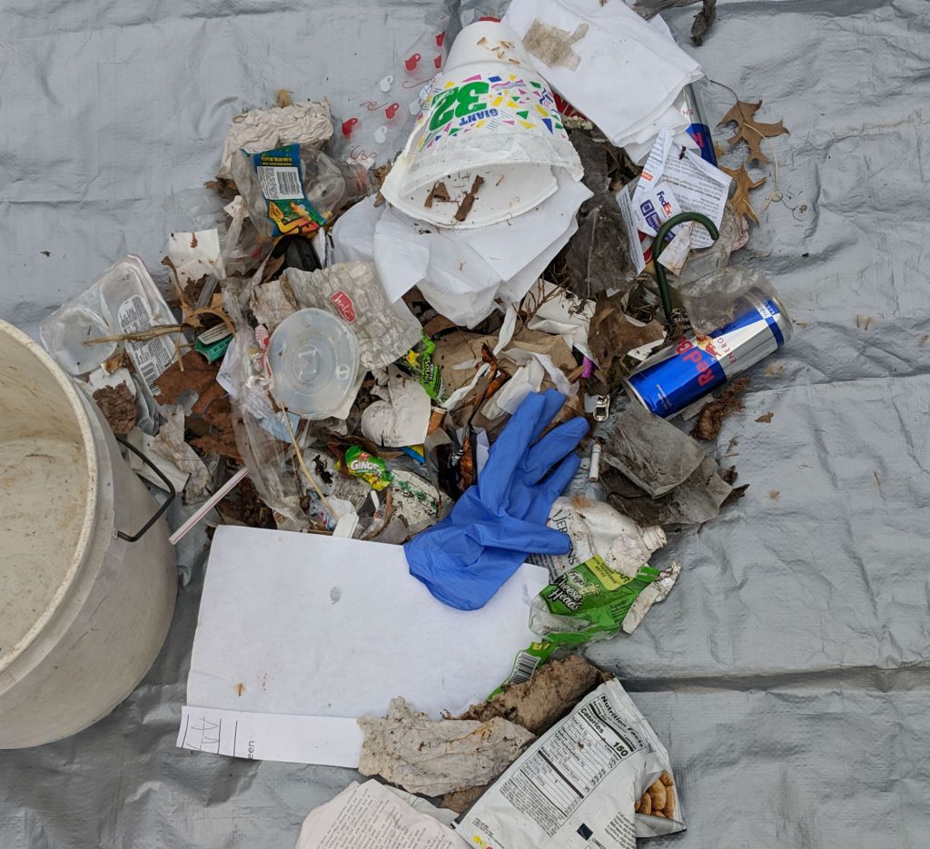 I think I first ventured out to pick up trash a few days before this, but it didn’t occur to me to record photos until I did it on April 10, 2018. So, for some messed up reason, I took a picture of what I collected this day.
